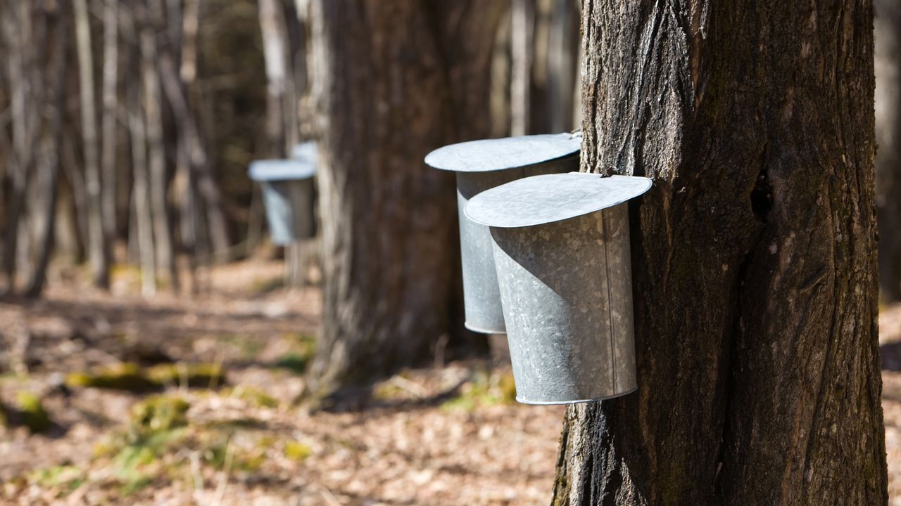 Buckets on maple trees collecting sap for maple syrup (© capecodphoto/Getty Images)(Bing Canada)